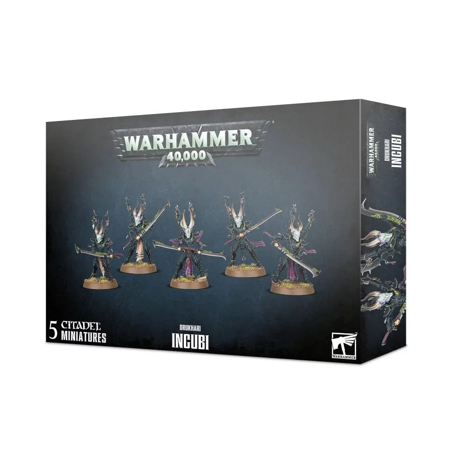 This kit is supplied in 68 plastic components and comes with 5 28.5mm Citadel round bases and a 25mm round base. It builds either 5 Incubi or 4 Incubi and a Klaivex. The Klaivex can be assembled either with a pair of joined demiklaives or separated demiklaives and also has a choice of two heads. The kit also includes a single-piece Drukari symbol that could optionally be used as an objective marker.